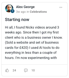 The reality is, anything worthwhile takes effort. This isn’t a magic button, and it won’t happen overnight. But inside AI Inner Circle you’ll have access to the exact SOPs, outreach frameworks, and automation systems designed to help you start conversations with business owners and turn those conversations into paying clients. Many members land their first client well before the 90-day mark.